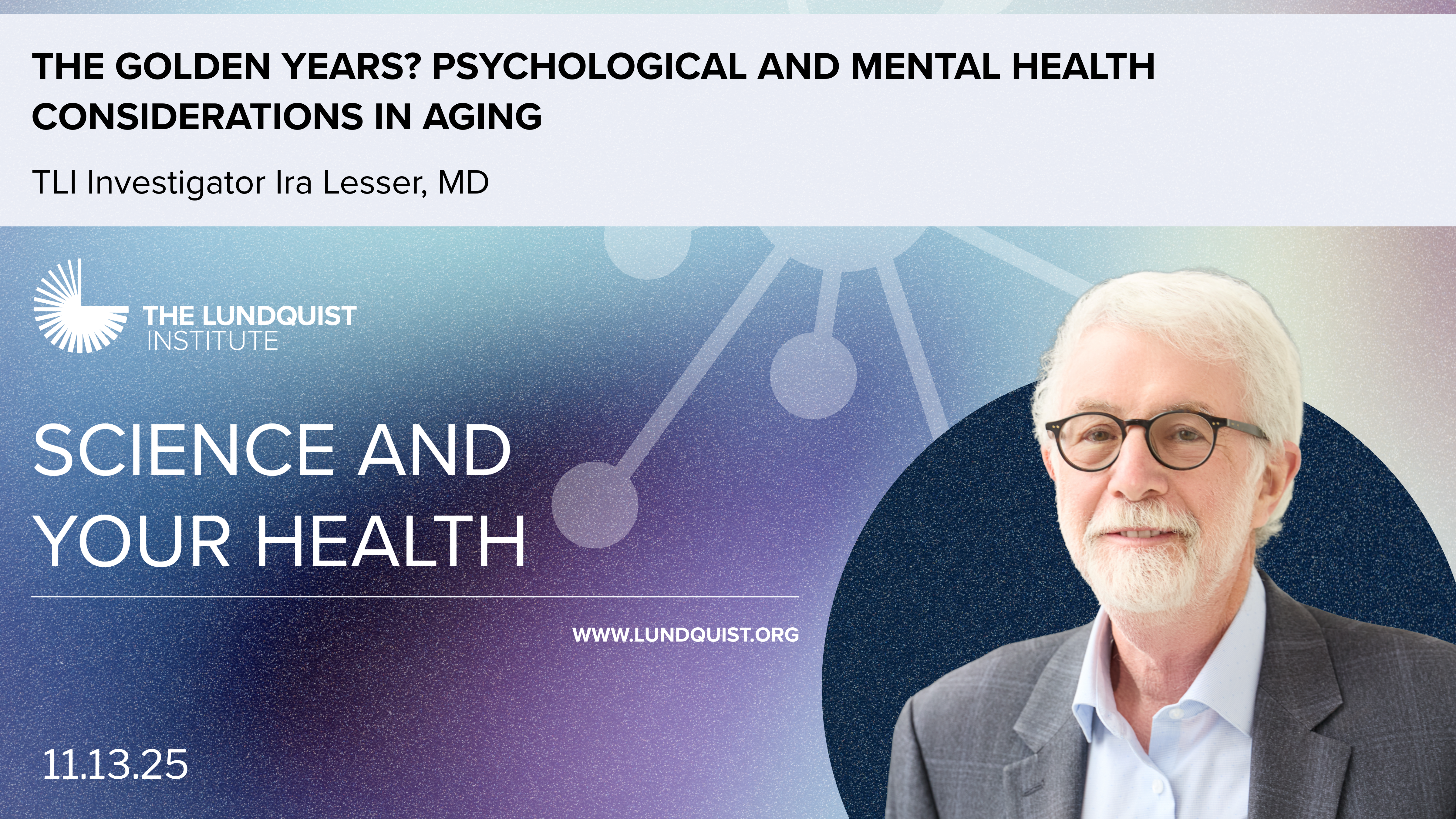 On November 13, please join TLI Investigator Ira Lesser, MD as he speaks on the topic, “The Golden Years? Psychological and Mental Health Considerations in Aging.”